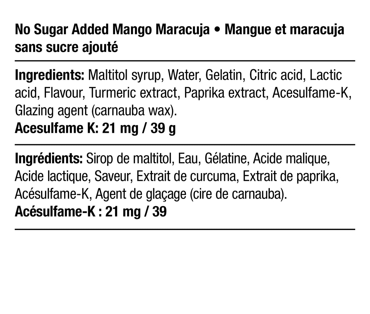 Vous coupez le sucre? On vous appuie! C’est pourquoi nous avons créé une version sans sucre de nos célèbres bonbons Mangue et maracuja. Vous pouvez maintenant dévorer cette combinaison juteuse aux saveurs de mangue et de fruit de la passion, tout en surveillant votre consommation de sucre!
