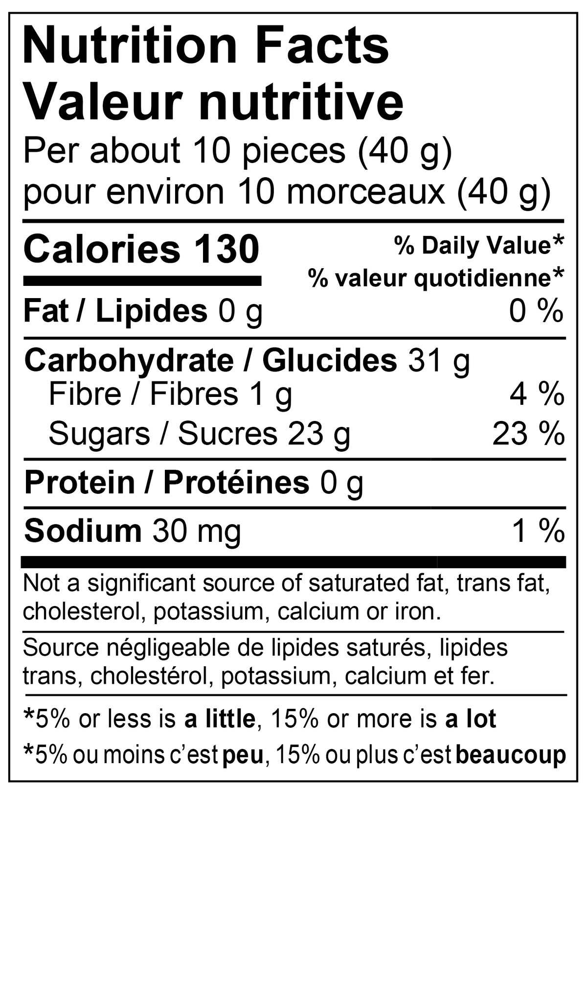 * Nos bonbons sans gélatine présentent généralement une texture plus ferme, alors que ceux contenant de la gélatine sont plus tendres.